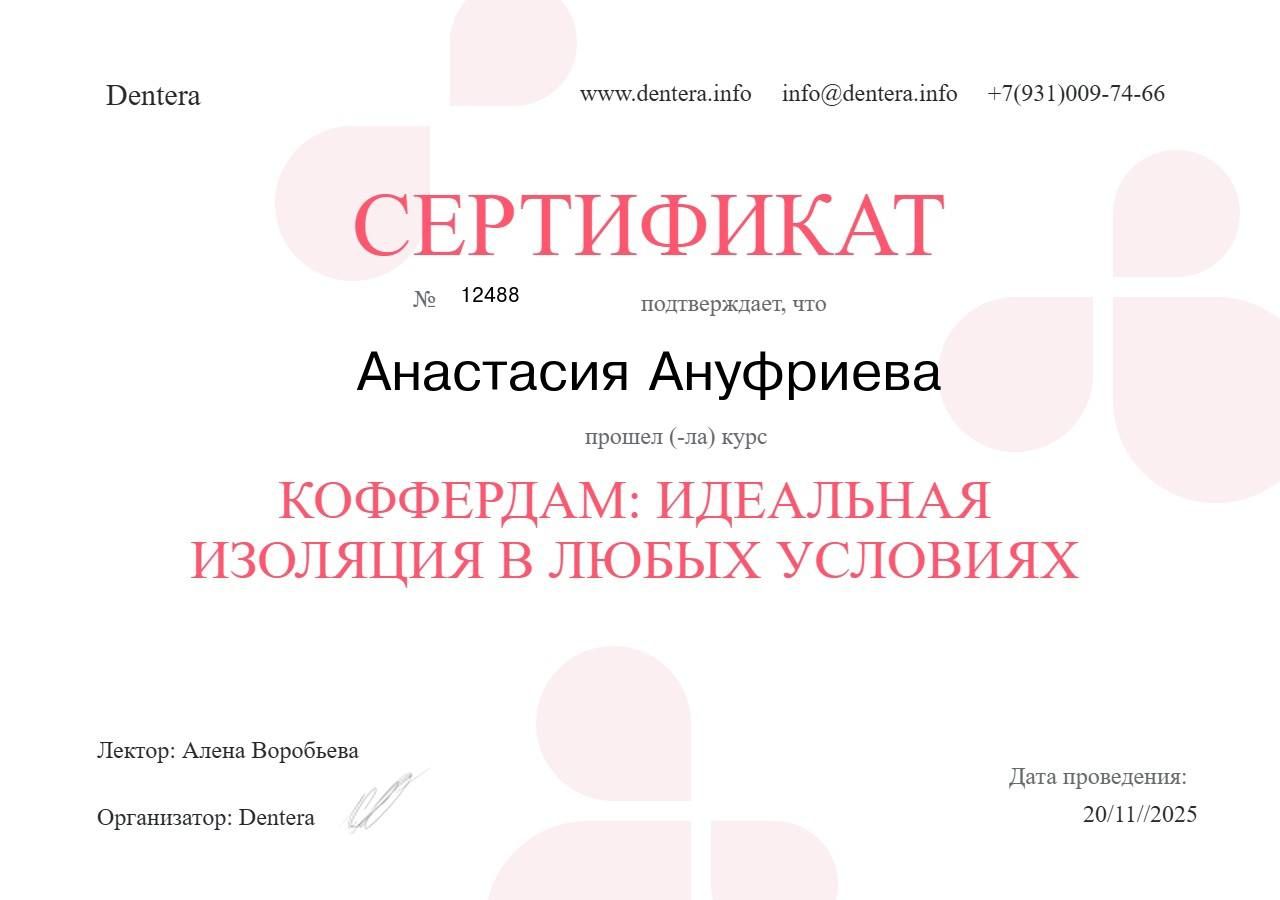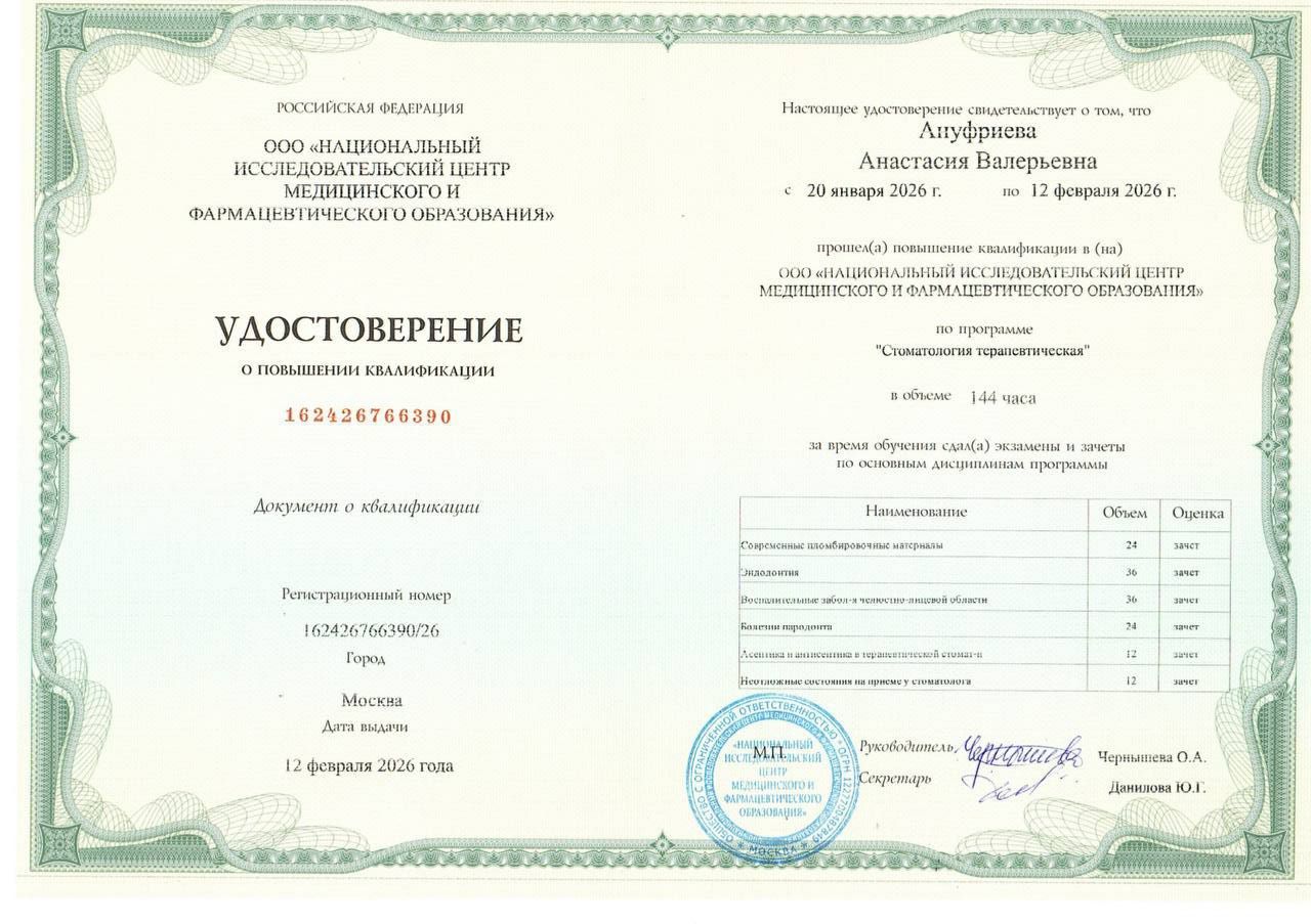 - \"Стоматология терапевтическая\" от 19.06.2023, \"Стоматология общей практики\" от 14.07.2021 Специальность Врач-стоматолог-терапевт\\"Стоматология терапевтическая\" 12.02.2026